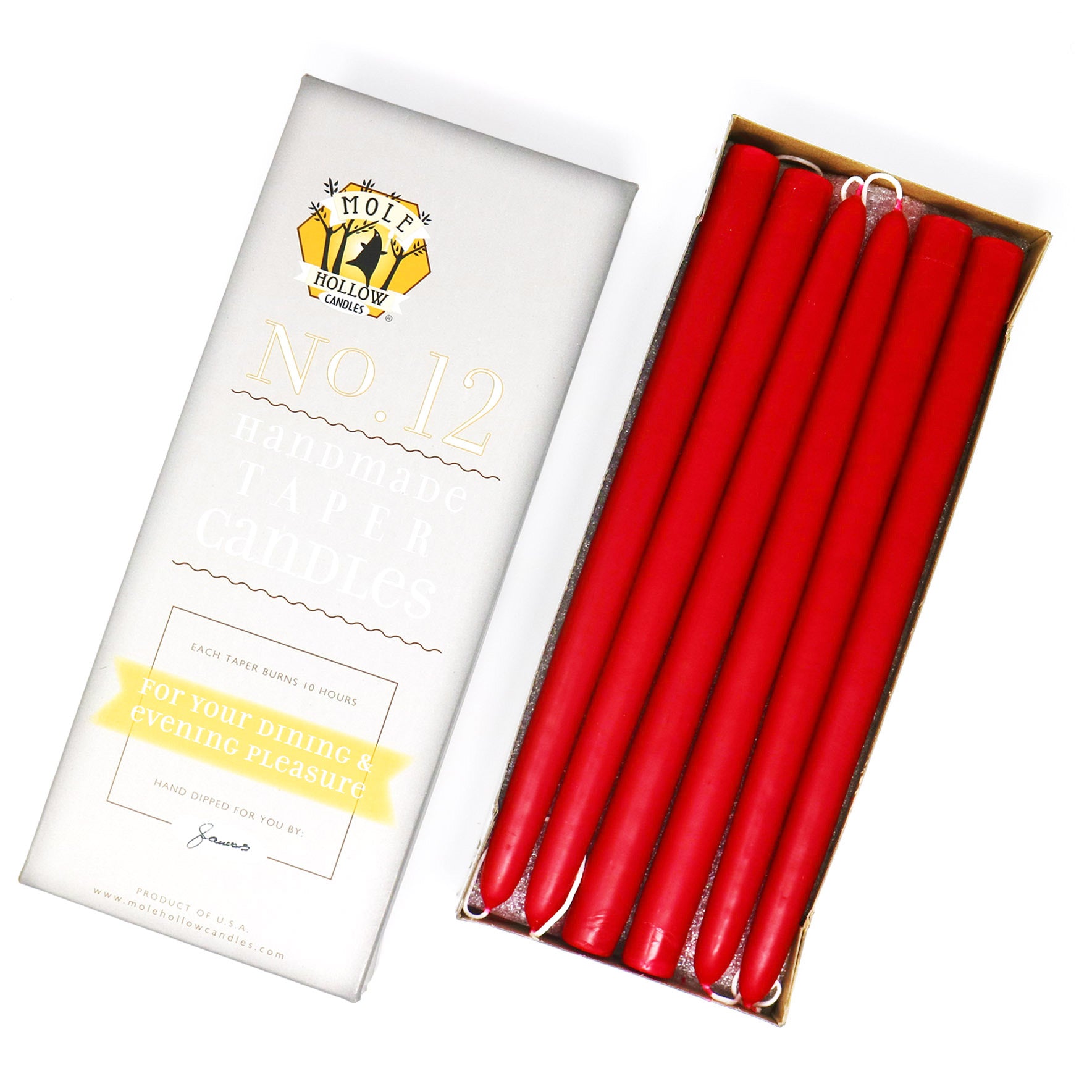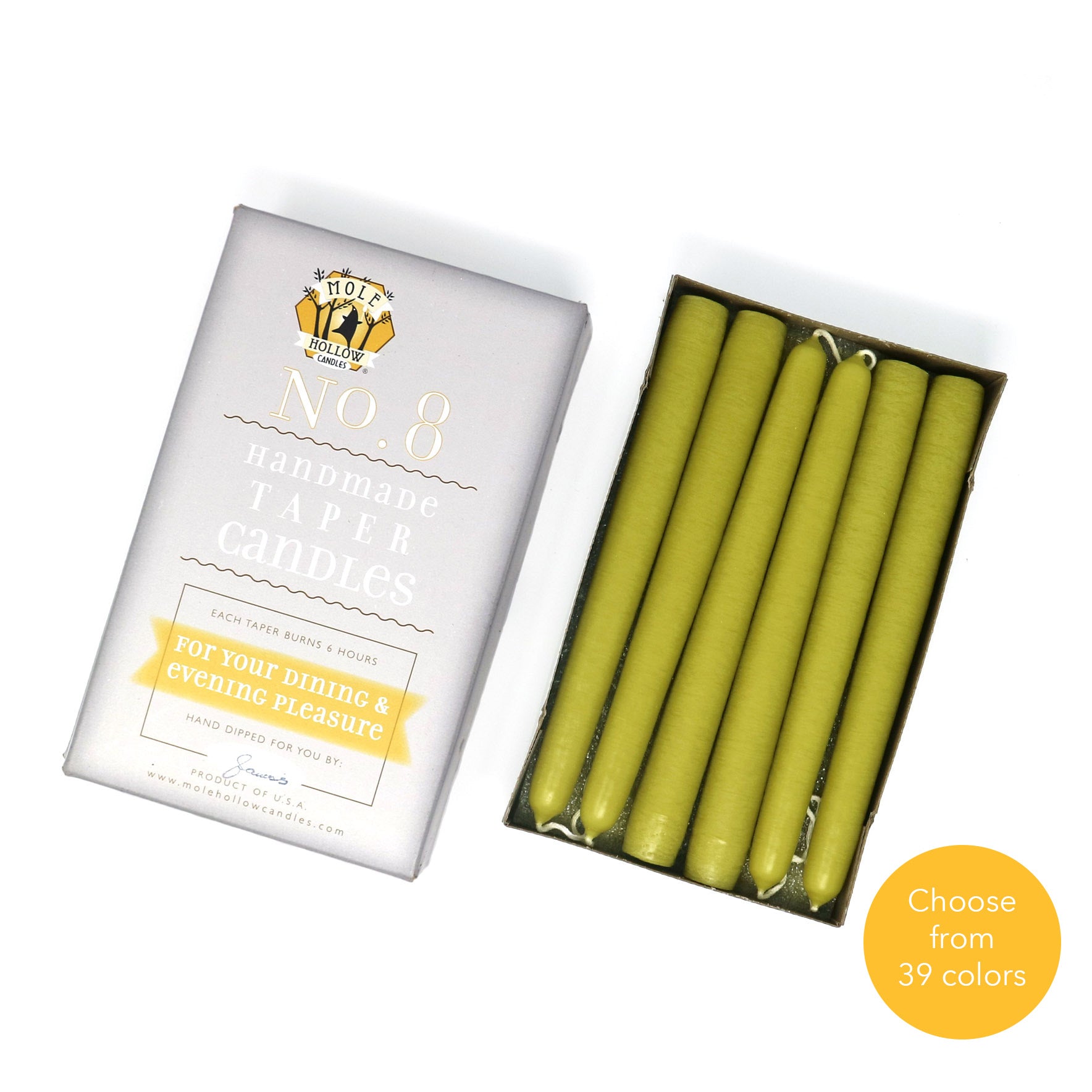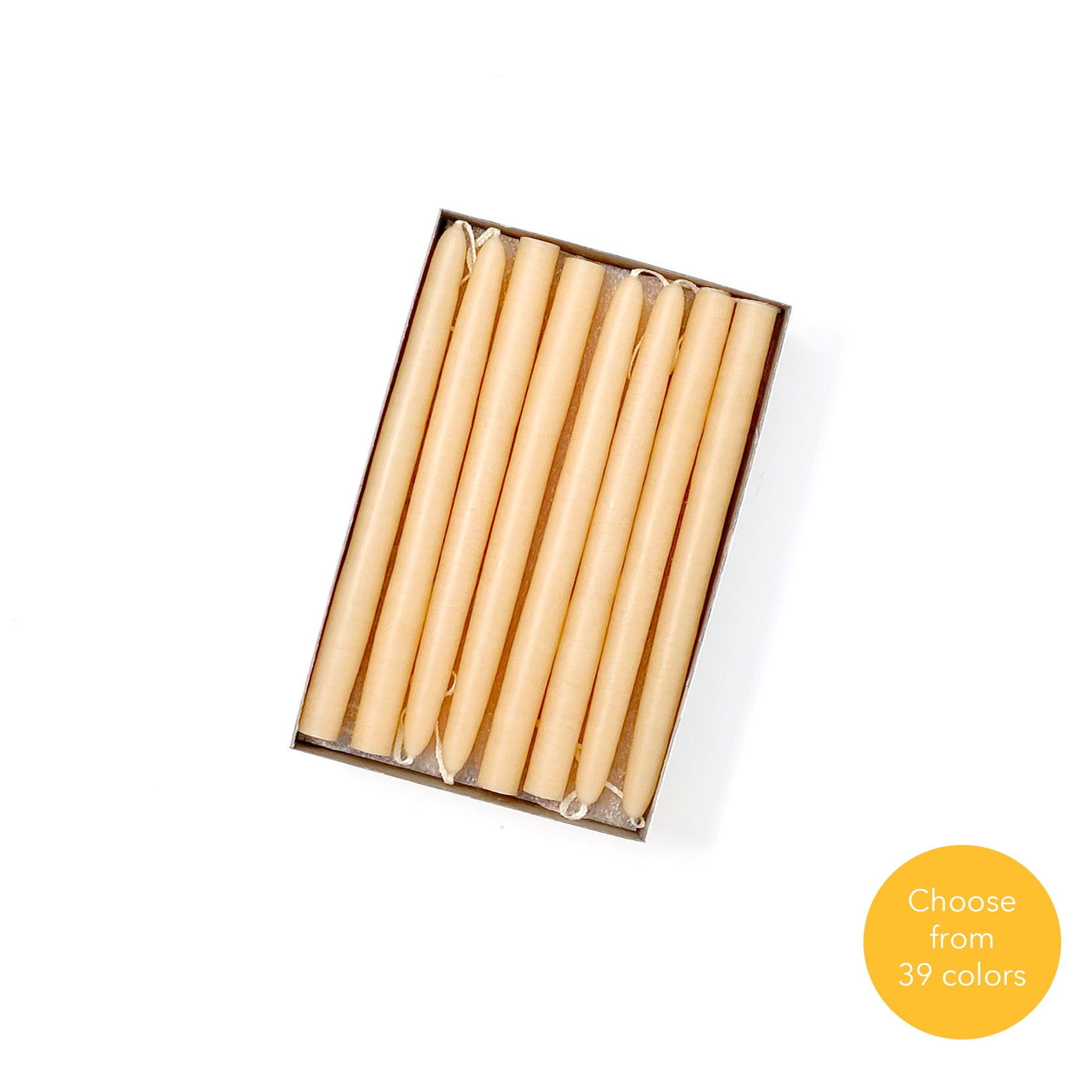 Our hand dipped standard size taper candles, or dinner candles, are sized at 7/8" diameter to fit most tapered candle holders. Each taper candle features our signature Spun Finish - a subtle linen-like pattern. Dripless taper candles are available in sets of 12, in 6", 8", 10" and 12" lengths. Choose from a range of 39 colors and find a colored candle to suit any occasion.