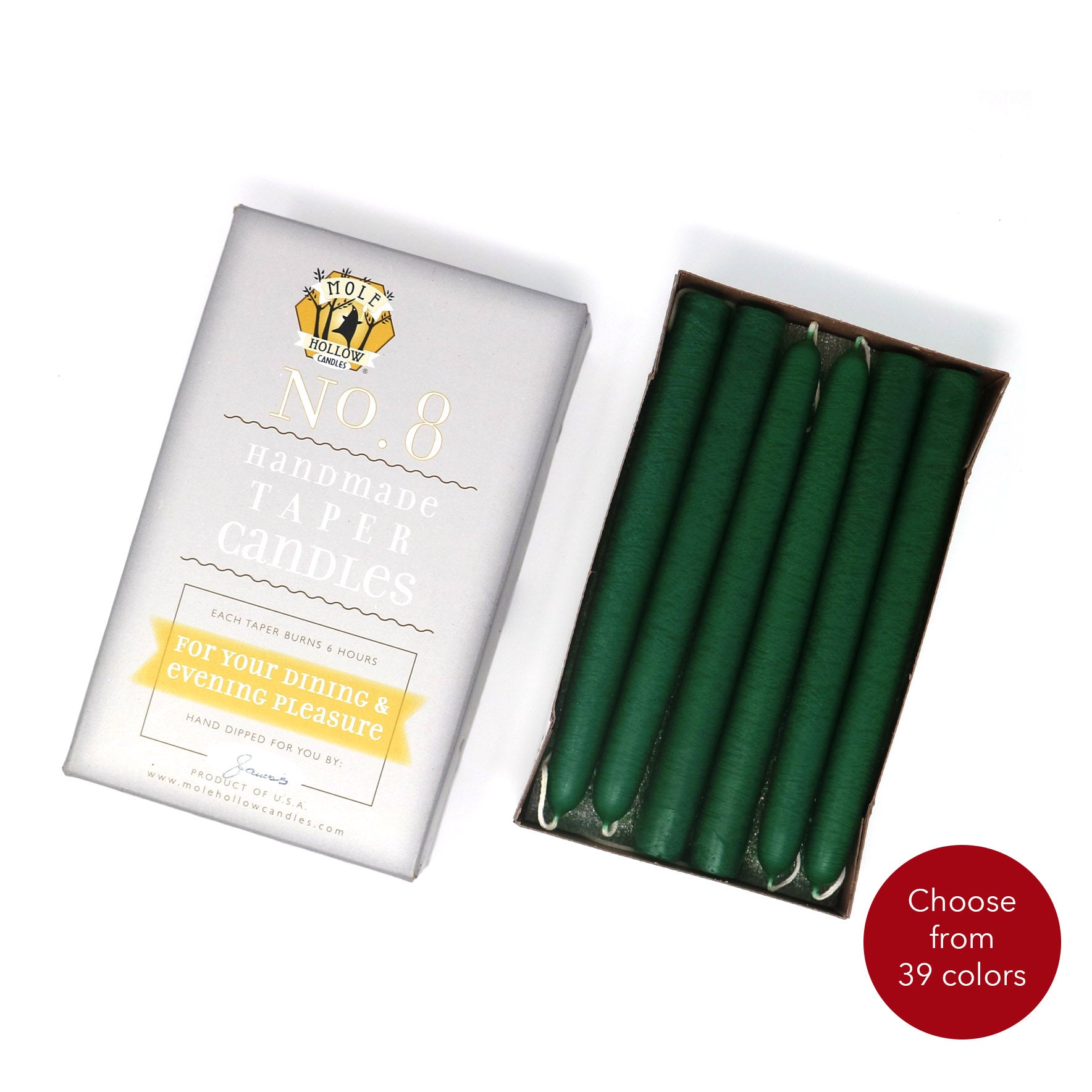 Our hand dipped standard size taper candles, or dinner candles, are sized at 7/8" diameter to fit most tapered candle holders. Each taper candle features our signature Spun Finish - a subtle linen-like pattern. Dripless taper candles are available in sets of 12, in 6", 8", 10" and 12" lengths. Choose from a range of 39 colors and find a colored candle to suit any occasion.