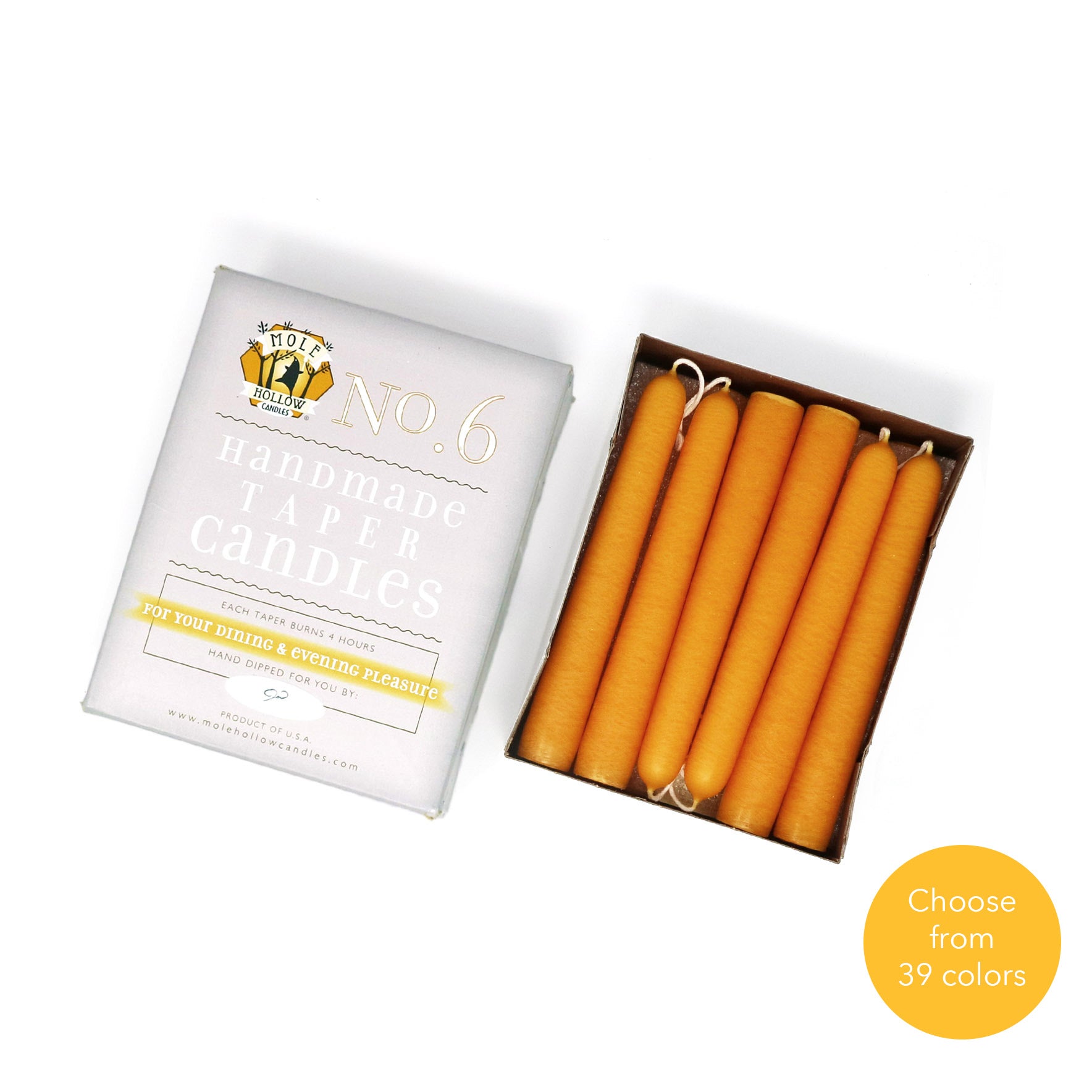 Standard-sized taper candles are our most popular type of candle. Sized at 7/8” diameter, standard tapers fit most conventional candlesticks. Choose from four sizes – 6” tapers, 8” taper candles, 10” tapers and 12” tall taper candles – in 39 colors. Tapered candles make great candles for hostess gifts, special tablescapes, or candles for events. Our unscented handcrafted taper candles have solid color throughout. These tapers are dripless when burned in normal indoor conditions.